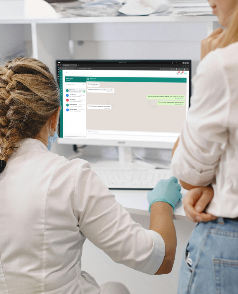 Todas as conversas da sua clinica centralizadas. Responda leads do WhatsApp e Instagram DMs sem alternar entre apps. Com histórico completo, reações, áudios e atribuição de campanha.
